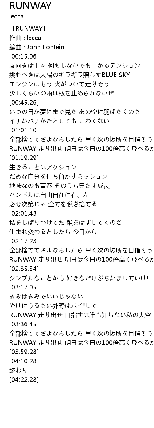 | [03:49.17] | RUNWAY 走り出せ 明日は今日の100倍高く飛べるから |