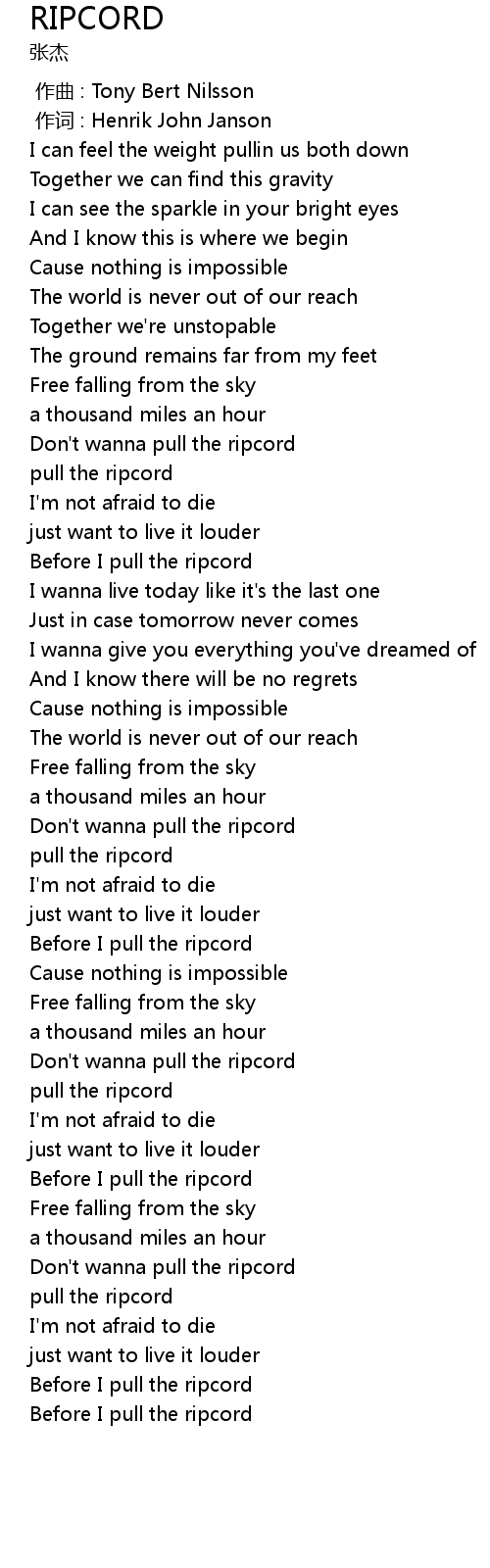 | [01:03.730] | Don' t wanna pull the ripcord |
