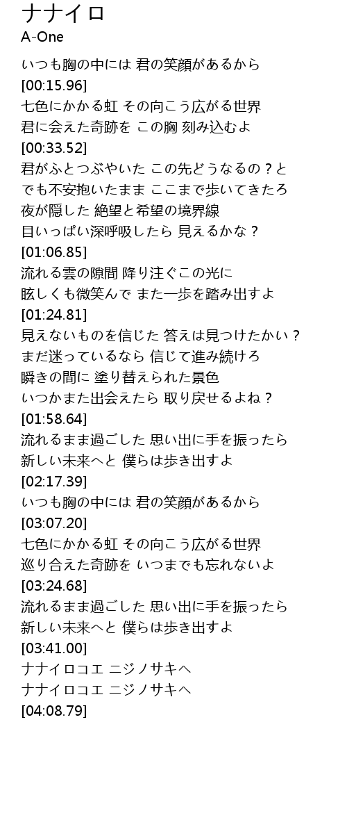 | [03:41.20] | ナナイロコエ ニジノサキヘ |