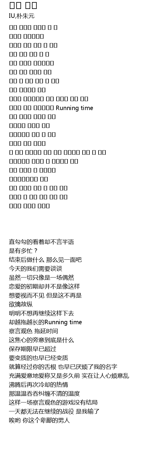 | [01:36.789] | 애태우는 저의가 뭐야 |