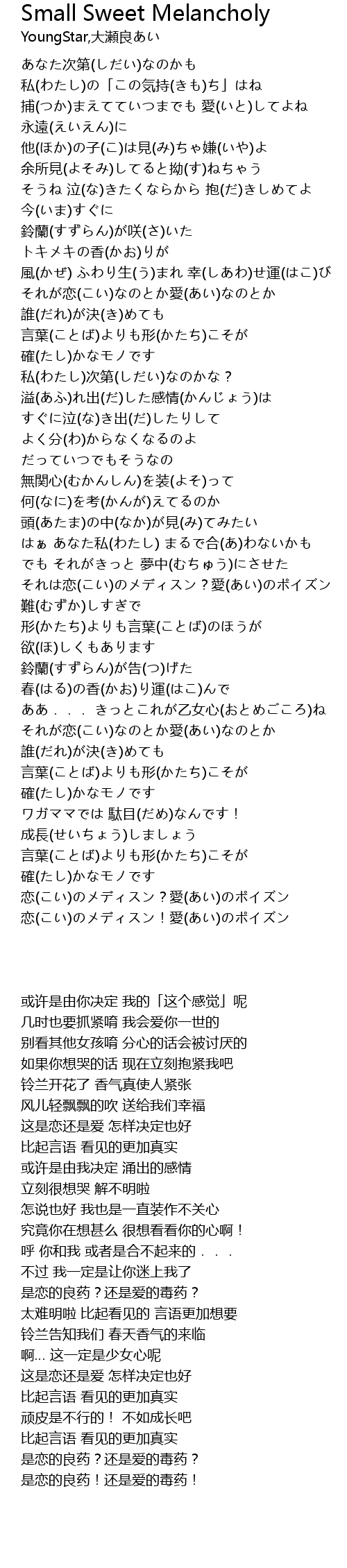 | [01:43.940] | それは恋(こい)のメディスン?愛(あい)のポイズン |