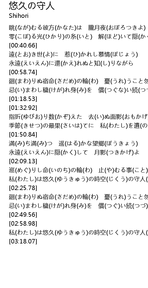 | [02:17.45] | 私(わたし)は悠久(ゆうきゅう)の時空(じくう)の守人(もりびと) |