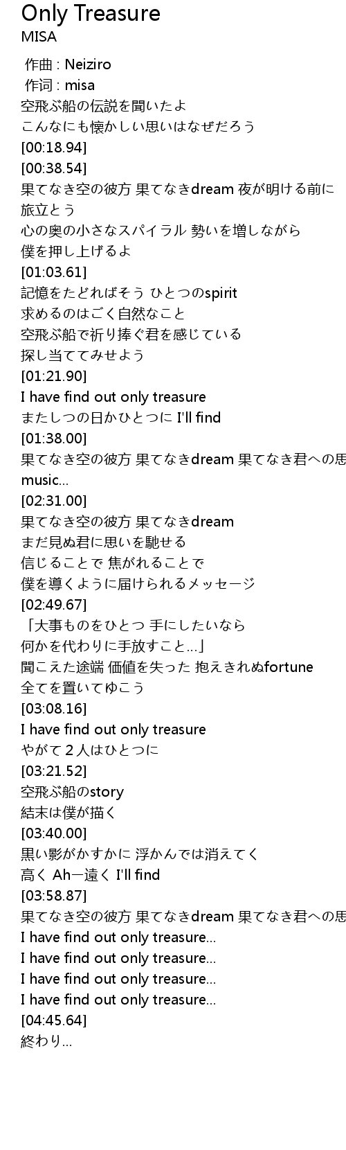 | [03:59.27] | 果てなき空の彼方 果てなきdream 果てなき君への思い |