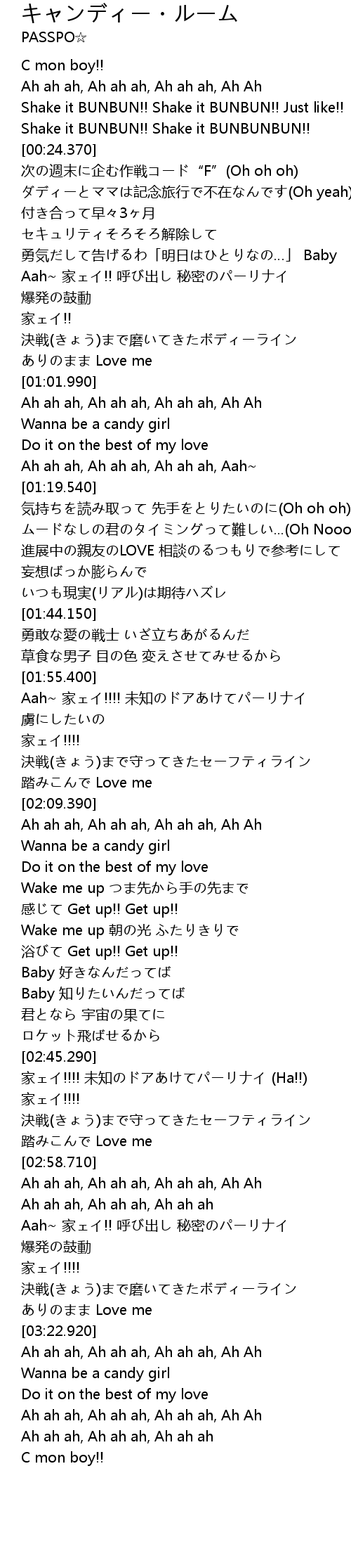 | [00:48.550] | Aah~ 家ェイ!! 呼び出し 秘密のパーリナイ |