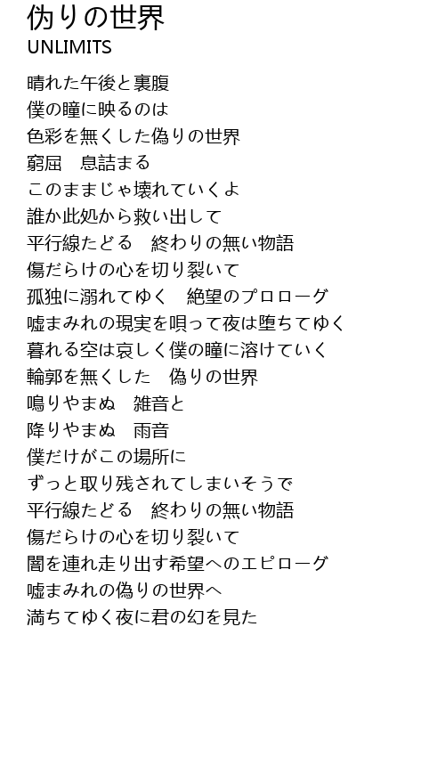 | [01:39.67] | 輪郭を無くした 偽りの世界 |
