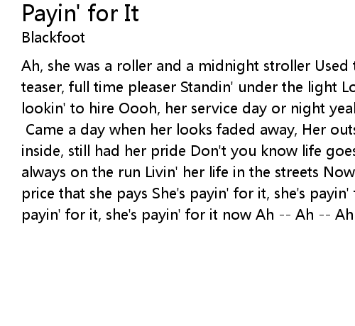 Ah, she was a roller and a midnight stroller Used to walk in the night A little teaser, full time pleaser Standin' under the light Lookin' for a buyer that was lookin' to hire Oooh, her service day or night yeah And she's payin' for it now [Chorus:] Came a day when her looks faded away, Her outside beauty was gone Yet inside, still had her pride Don't you know life goes on Tryin' to stay young, always on the run Livin' her life in the streets Now they look away, this is the price that she pays She's payin' for it, she's payin' for it now Ah, she's payin' for it, she's payin' for it now Ah -- Ah -- Ah -- Ah -- [Repeat Chorus] |
