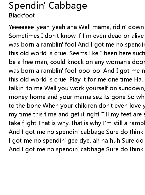 Yeeeeeee-yeah-yeah aha Well mama, ridin' down this highway, Oh highway 95 Sometimes I don't know if I'm even dead or alive And that is why, that is why I was born a ramblin' fool And I got me no spendin' cabbage And I sure do think this old world is cruel Seems like I been here such a long time before Used to be a free man, could knock on any woman's door And that is why, that is why I was born a ramblin' fool-ooo-ool And I got me no spendin' cabbage Sure do think this old world is cruel Play it for me one time Ha, ha, ha Yes, all you'all talkin' to me Well you work yourself on sundown, workin' like a dog Bring your money home and your mama sez its gone So what's the use in workin' your fingers to the bone When your children don't even love you, Lord, when you're gone Take my time this time and get it right Till my feet are spreadin' dem wings, time to take flight That is why, that is why I'm still a ramblin' fool I'm such a fool And I got me no spendin' cabbage Sure do think this old world is cruel Yeah And I got me no spendin' gee dye, ah ha huh Sure do think this old world is cruel And I got me no spendin' cabbage Sure do think this old world is cruel |