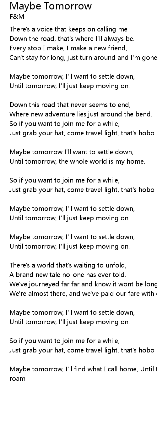 Maybe tomorrow, I'll find what I call home, Until tomorrow, you know I'm free to roam |