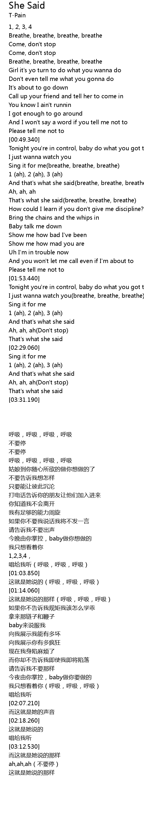 | [01:18.490] | That's what she said(breathe, breathe, breathe) |