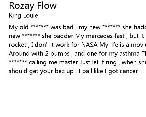 | My old ******* was bad , my new ******* she badder My old ******* was bad , my new ******* she badder My mercedes fast , but it could be faster Just got me a rocket , I don’t work for NASA My life is a movie , catch me on the plasma Around with 2 pumps , and one for my asthma They know I’m the king , these ******* calling me master Just let it ring , when she call up don’t answer You should get your bez up , I ball like I got cancer |