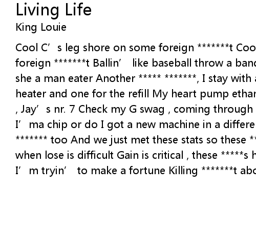 | Cool C' s leg shore on some foreign t Cool C' s leg shore on some foreign t Ballin' like baseball throw a band at you Spicy chica shotgun she a man eater Another , I stay with a cheater Extendo for the heater and one for the refill My heart pump ethane and my gas expensive No ' 87 , Jay' s nr. 7 Check my G swag , coming through a bag Being broke is sad, and I' ma chip or do I got a new machine in a different due Some of my like too And we just met these stats so these new And all I know is when lose is difficult Gain is critical , these s horrible Ask the oracle, I' m tryin' to make a fortune Killing t abortion , new extortions |