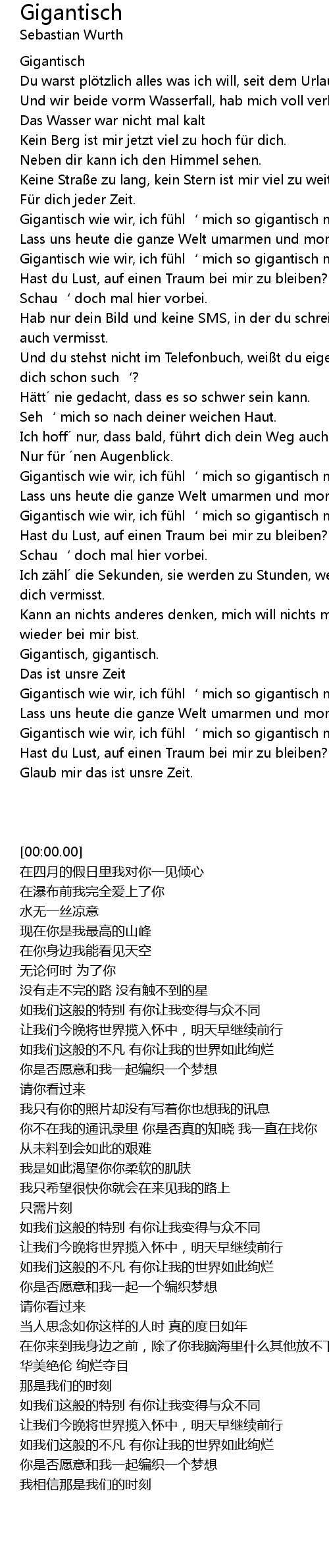 | [03:31.38] | Gigantisch wie wir, ich fü hl' mich so gigantisch mit dir. |