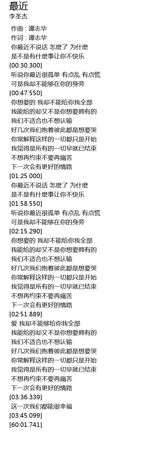 | [01:45.080] | 你最近不说话 怎麽了 为什麽 |