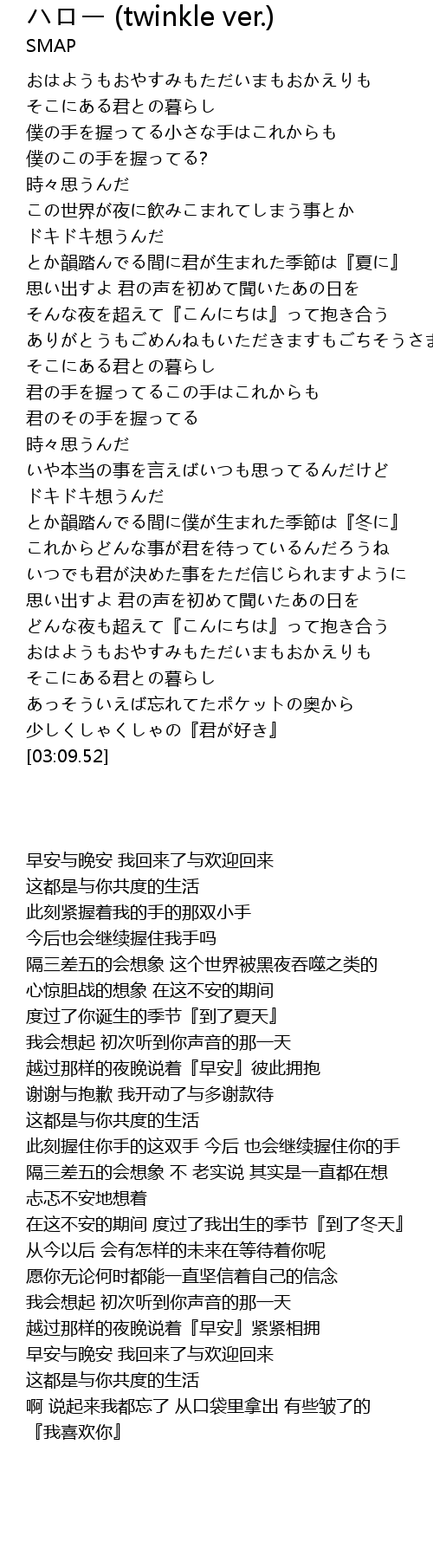 | [00:11.28] | おはようもおやすみもただいまもおかえりも そこにある君との暮らし |