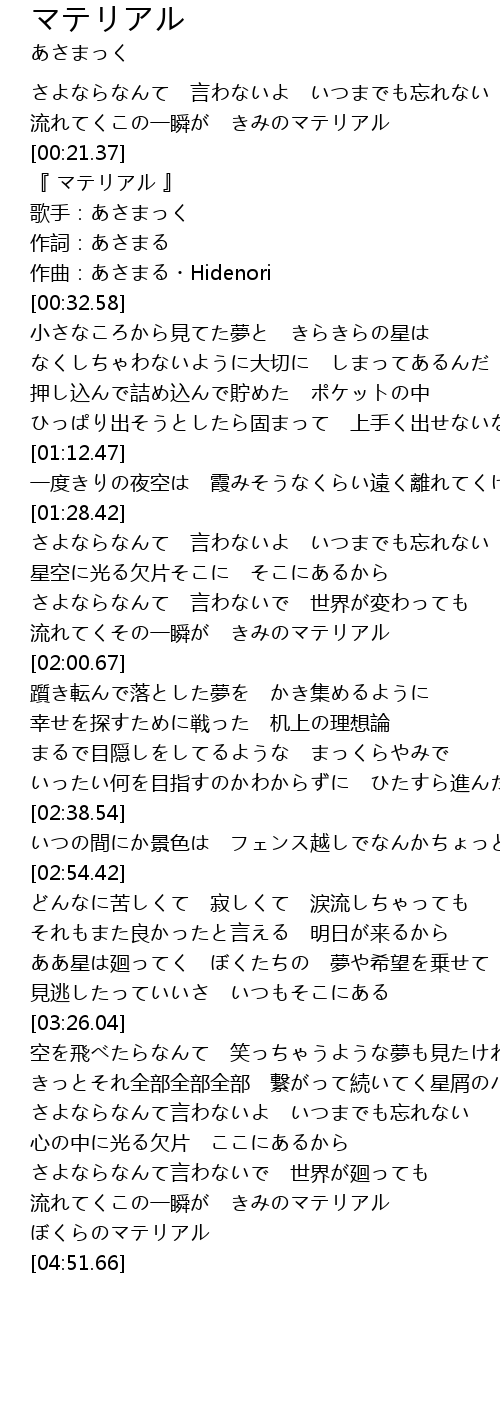 | [04:38.59] | 流れてくこの一瞬が きみのマテリアル |