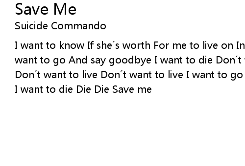 | I want to know If she s worth For me to live on In this world I want to know I want to go And say goodbye I want to die Don t want to live Don t want to live Don t want to live Don t want to live I want to go I want to die I want to go I want to die Die Die Save me |