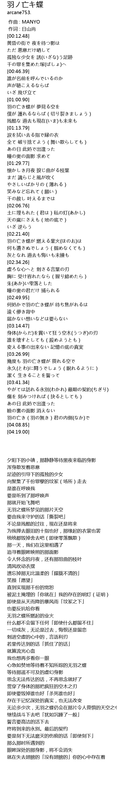 | [02:21.41] | 羽の亡き蝶が 燃える業火(ほのお)は |