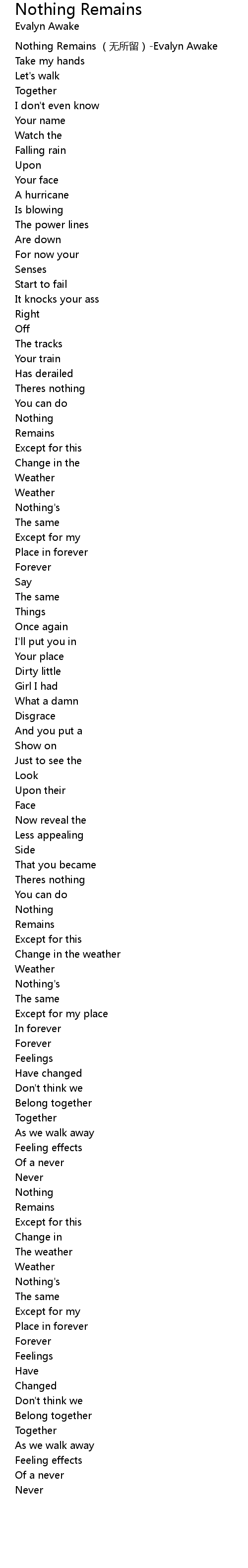 | [00:00.00] | Nothing Remains (无所留)-Evalyn Awake |