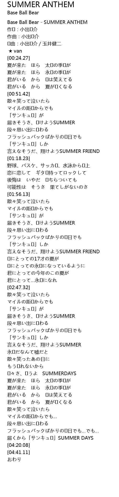 | [00:00.00] | Base Ball Bear SUMMER ANTHEM |
