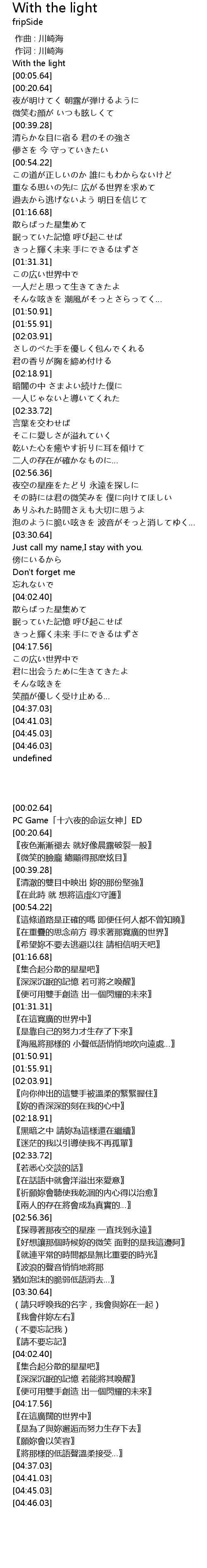 | [01:02.91] | 重なる思いの先に 広がる世界を求めて |