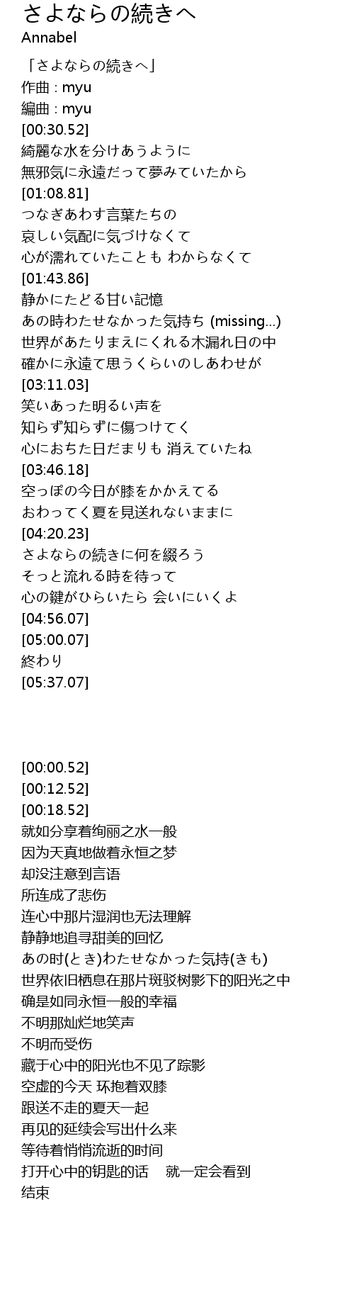 | [04:20.84] | さよならの続きに何を綴ろう |