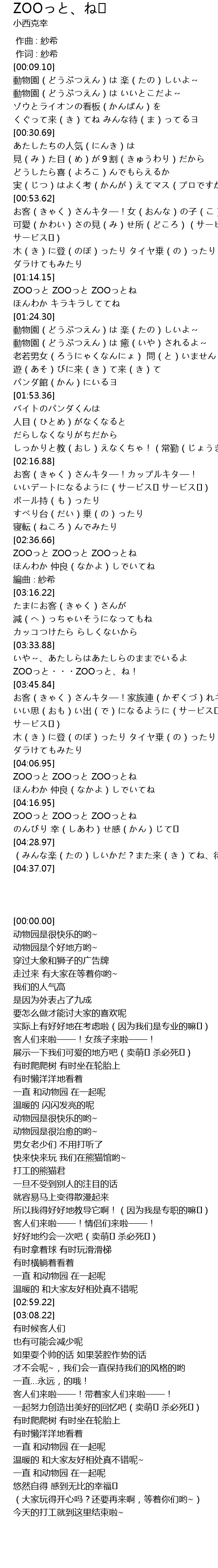 | [00:11.07] | 動物園(どうぶつえん)は 楽(たの)しいよ~ |