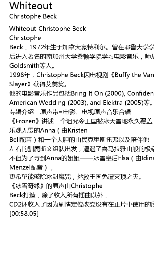 | [00:49.35] | 《冰雪奇缘》的原声由Christophe Beck打造,除了收入所有插曲以外, |