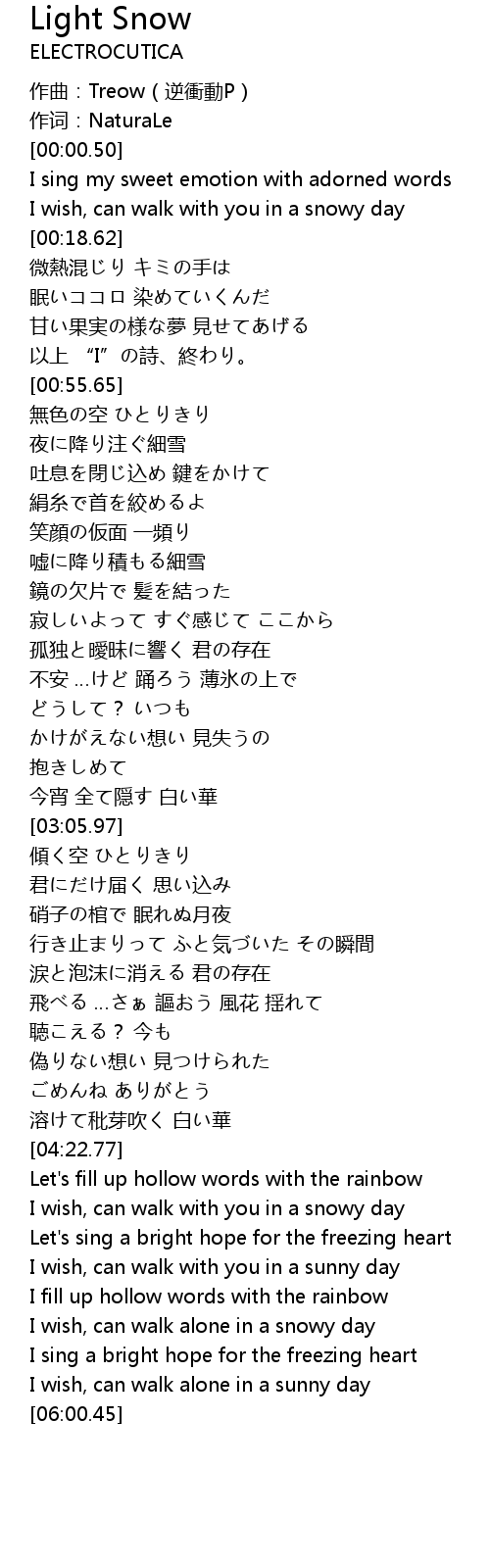 | [02:11.68] | 嘘に降り積もる細雪 |