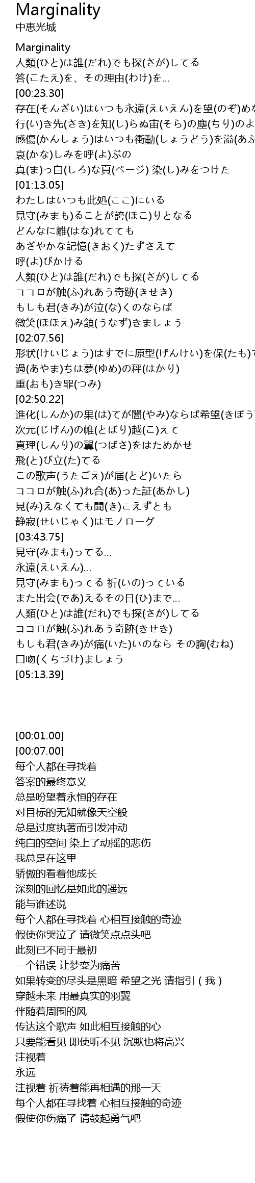 | [01:43.41] | 人類(ひと)は誰(だれ)でも探(さが)してる ココロが触(ふ)れあう奇跡(きせき) |