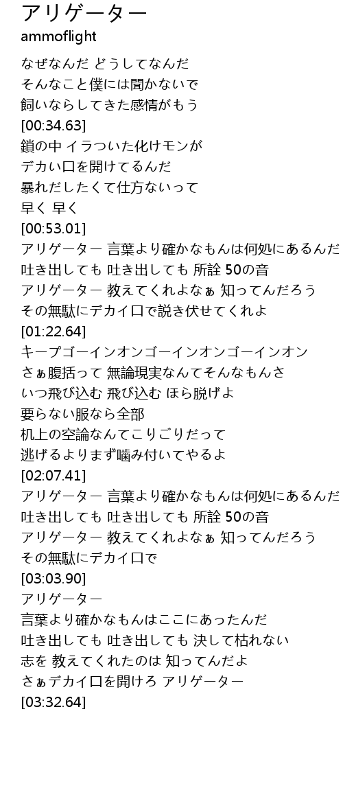 | [02:53.79] | アリゲーター 教えてくれよなぁ 知ってんだろう |