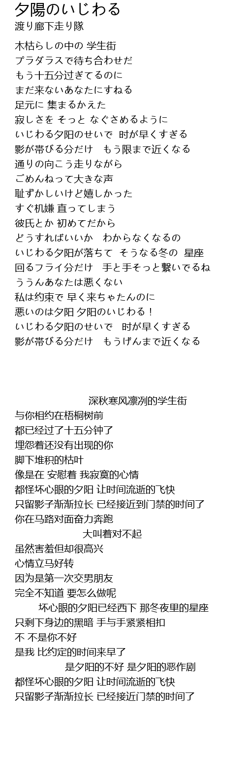 | [00:58.32] | いじわる夕阳のせいで 时が早くすぎる |