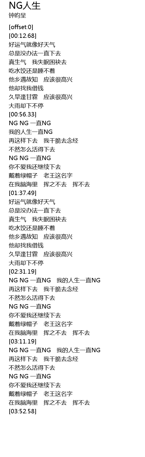 | [03:12.44] | NG NG 一直NG 我的人生一直NG |