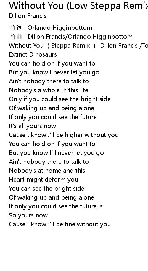 | [00:00.00] | Without You Steppa Remix Dillon Francis Totally Enormous Extinct Dinosaurs |
