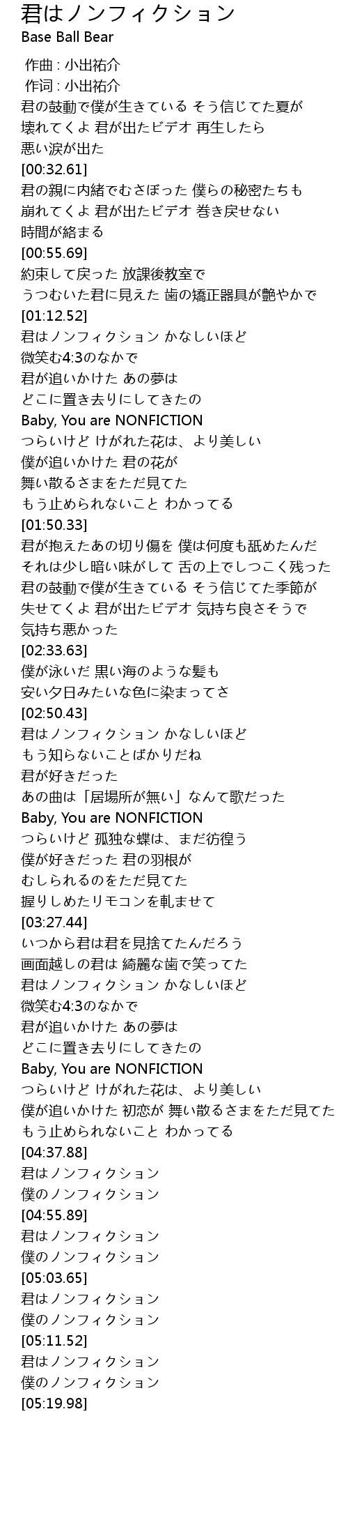 | [02:50.66] | 君はノンフィクション かなしいほど もう知らないことばかりだね |