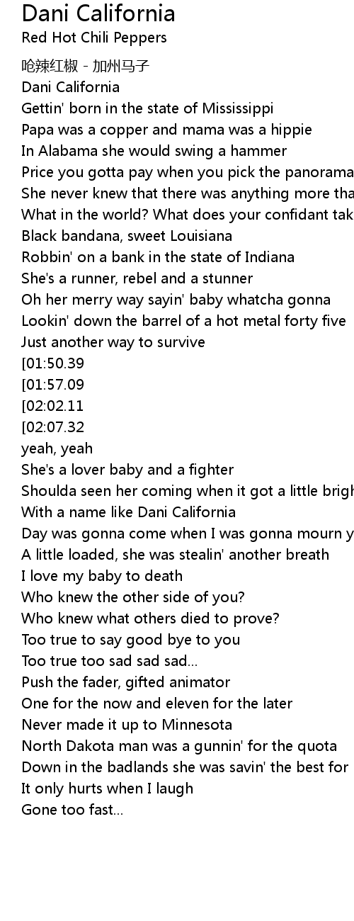 | [01:06.86][02:02.11][03:12.28][03:34.73] | California show your teeth |