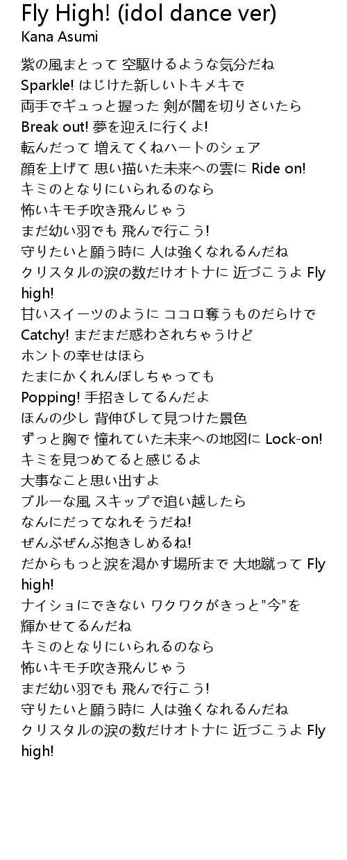 | [03:24.728] | クリスタルの涙の数だけオトナに 近づこうよ Fly high! |