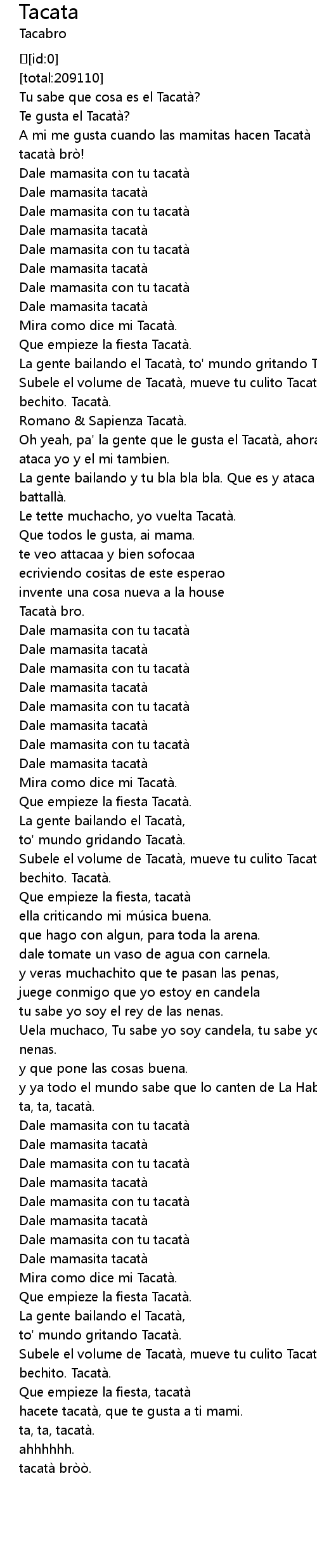 | [02:57.743] | Subele el volume de Tacata, mueve tu culito Tacata, tambien el bechito. Tacata. |