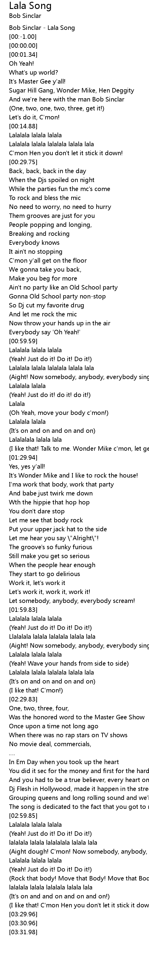 | [03:11.10] | Aight dough! C' mon! Now somebody, anybody, everybody sing! |