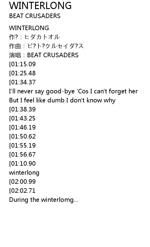 | [00:09.00][01:15.09][02:07.62][03:15.51] | BEAT CRUSADERS-WINTERLONG |