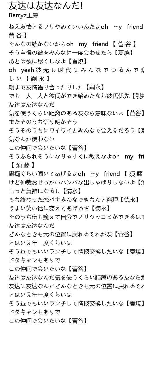 | [00:20.52] | ねえ友情とるフリやめていいんだよoh my friend 【 菅 谷 】 |