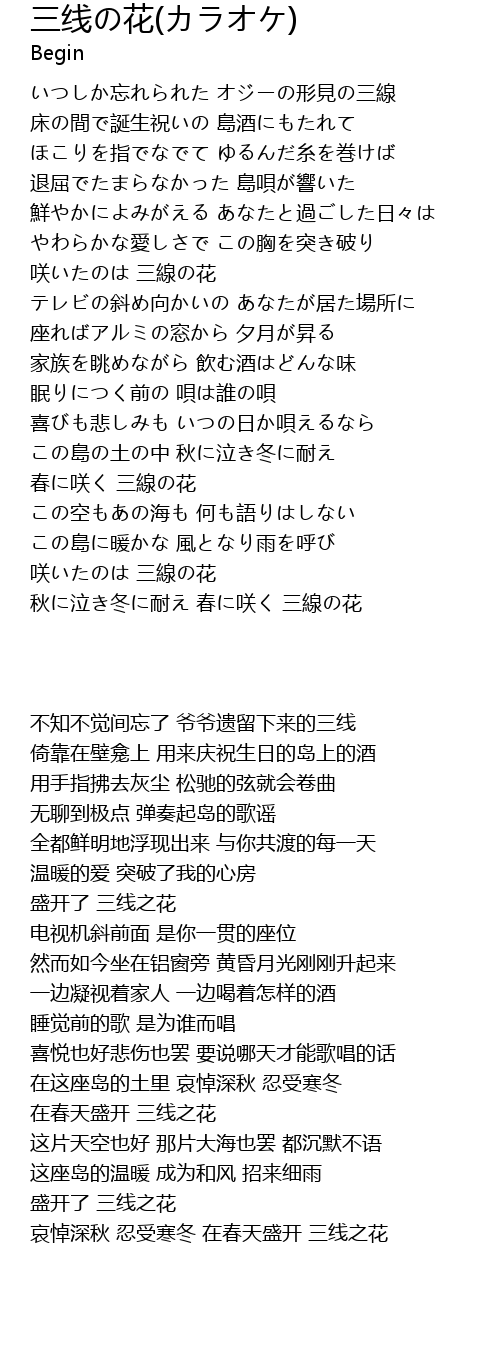 | [04:21.830] | 秋に泣き冬に耐え 春に咲く 三線の花 |