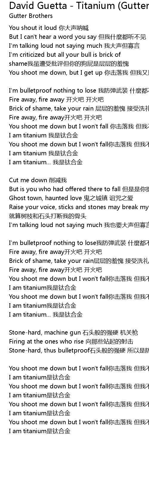 | You shoot me down but I won' t fall nǐ jī luò wǒ dàn wǒ bú huì dào | |