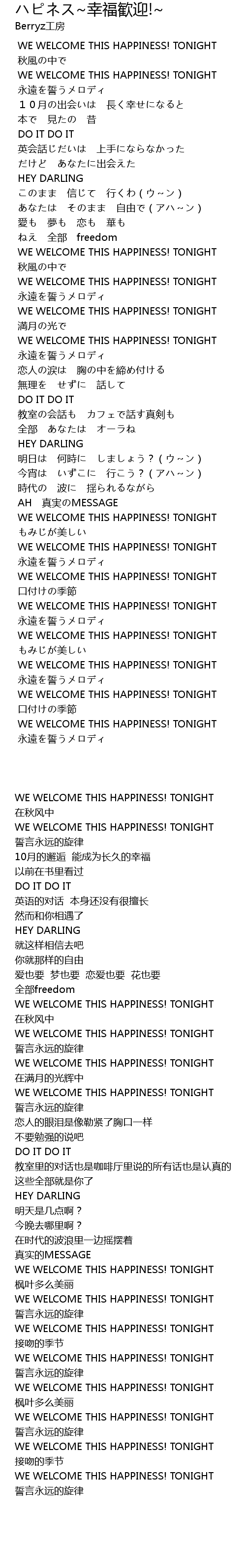 | [00:14.32] | WE WELCOME THIS HAPPINESS! TONIGHT |