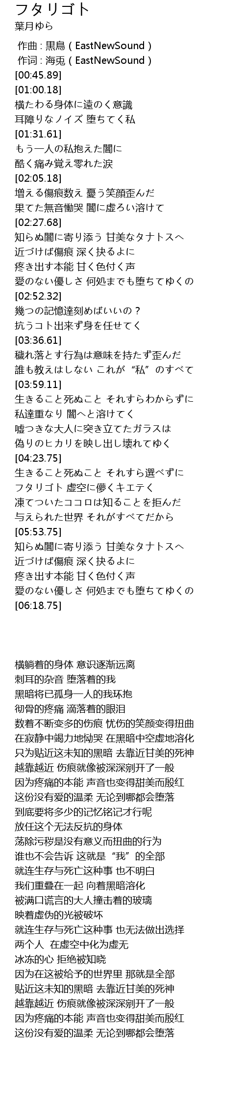 | [05:36.97] | フタリゴト 虚空に儚くキエテく |