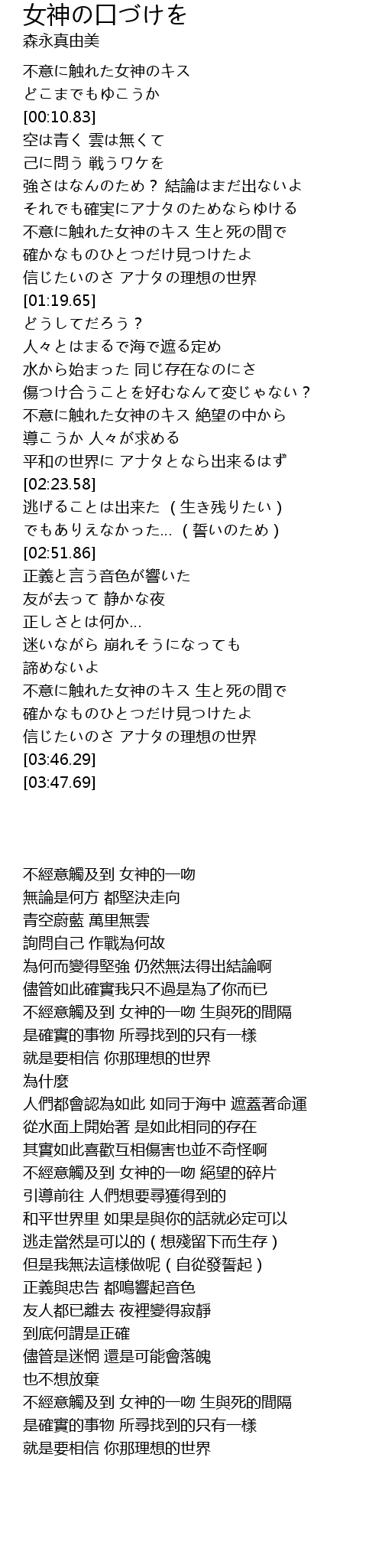 | [02:04.28] | 不意に触れた女神のキス 絶望の中から |