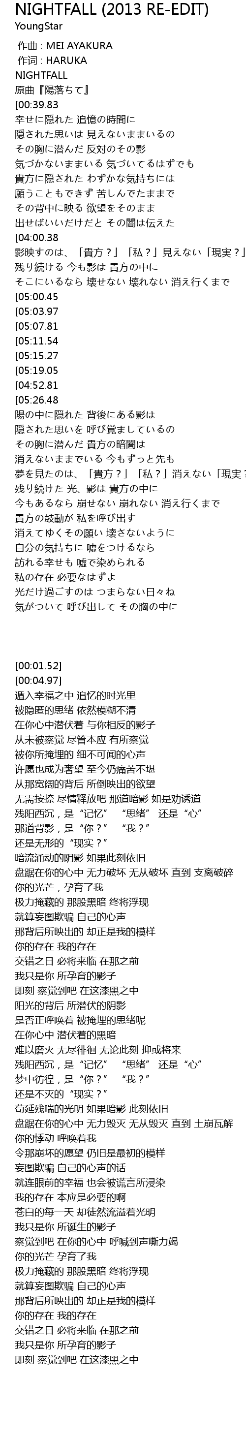 | [02:00.44][04:00.38] | 陽が落ちたのは、「記憶」「思い」それとも「心」 |