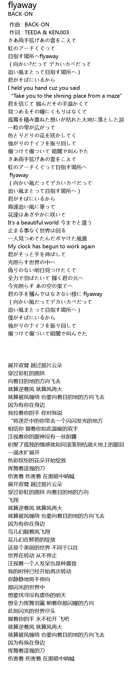 | [02:08.490] | 君の手を摑んではなさない様に flyaway |