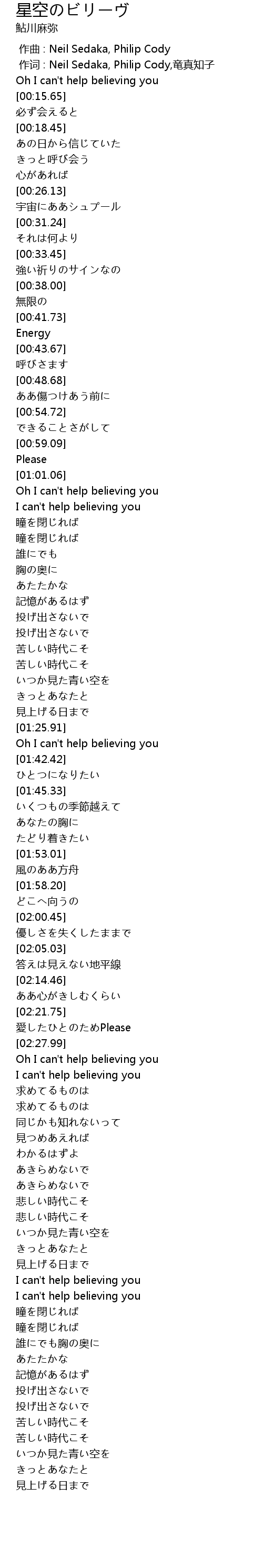 | [00:01.00] | 作词 : Neil Sedaka, Philip Cody,竜真知子 |