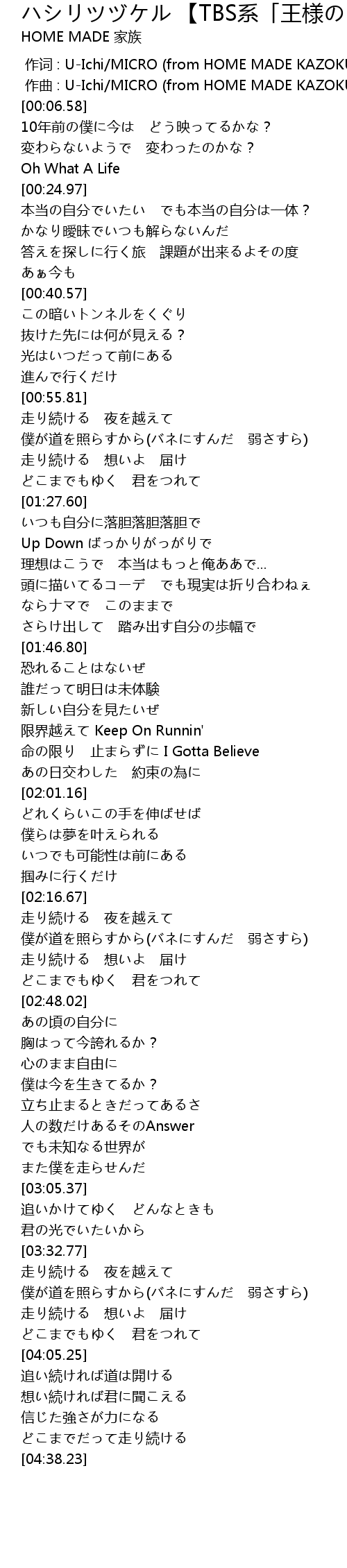 | [00:00.000] | 作词 : U-Ichi/MICRO (from HOME MADE KAZOKU)/Kuro |