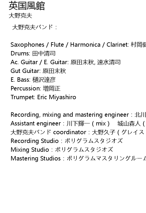 | Saxophones / Flute / Harmonica / Clarinet: 村岡健 | |